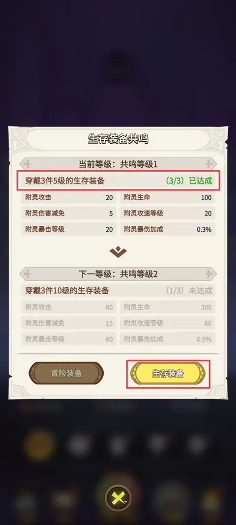 生存装备可提高玩家参与生存玩法时初始角色的属性,通过附灵、生存装备提高角色属性可以应对后续关卡更轻松。另外,生存装备还具有冒险词条,可在冒险模式中生效。