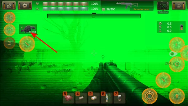 2、紧接着便是特殊功能引导,待玩家熟练掌握基础射击操作后,系统会解锁诸如“夜视仪”之类的特殊功能。玩家点击该功能,画面将切换至绿色的夜视视角。