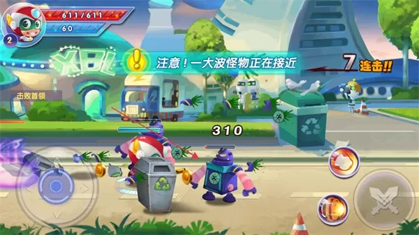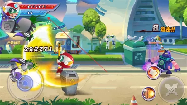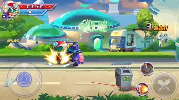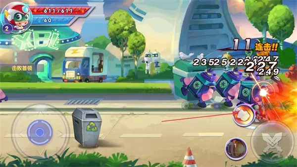 1. 注意屏幕左上角开心超人的生命值为611/611,能量值为60,利用左下方的虚拟摇杆来操控角色进行移动走位。