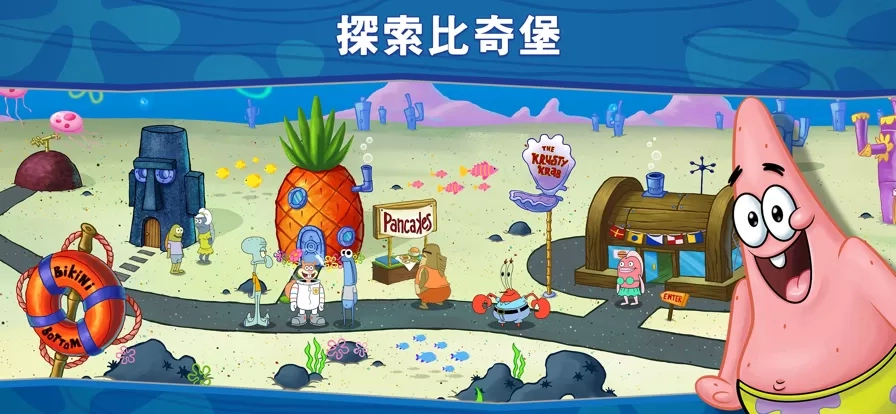 4、在这儿,不光能看到海绵宝宝,章鱼哥也在呢。而且呀,帕特里克会陪着我们在游戏里开心地成长哟!