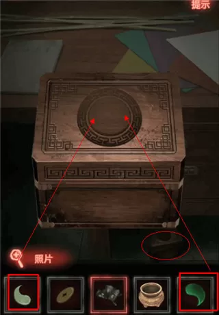 24、接着我们来到得到毛笔的桌上点击最下面的盒子,将两个小饰品一起放入进去,得到一把没有齿的钥匙。