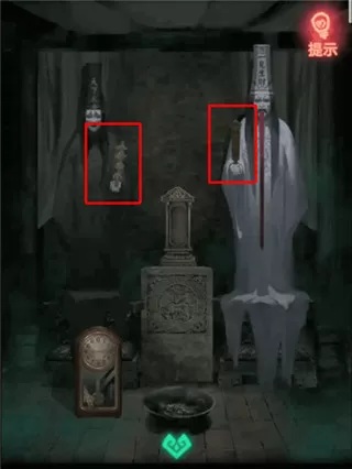 16、来到城隍庙左边的门,拿出令牌可以得到提示,这个提示是城隍庙右边时钟的提示,如图调整时钟,如图调整,打开得到符纸人,继续按照之前步骤将符纸人放在中间案台上,接着点击中间的画进行写状子。