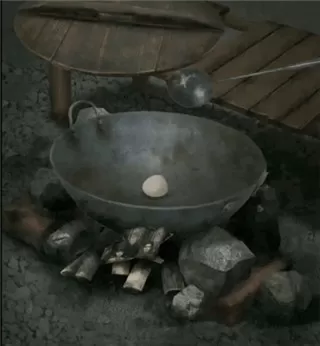 10、使用空的香炉收集水,点击锅,放入面粉还有水,点击锅上面的勺子进行搅拌,最后得到浆糊。