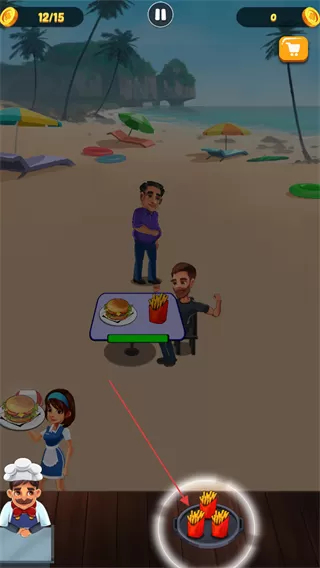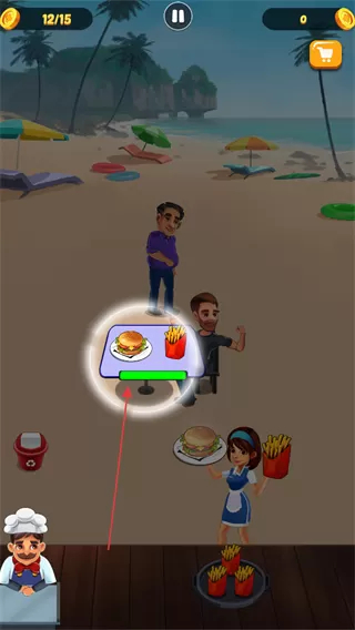 1. 开启游戏后,关注左上角显示的金币数量12/15 ,接着点击厨师旁边的食物图标,比如汉堡。
