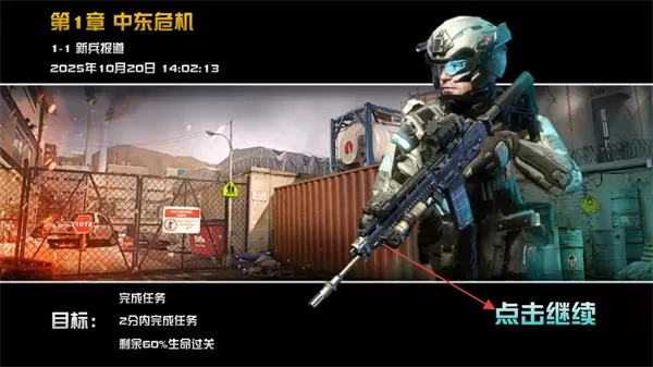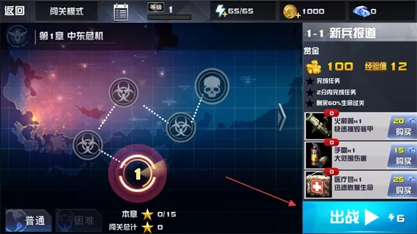1. 在关卡选择页面,以第1章中东危机里的1 - 1新兵报道为例,先明确关卡目标与奖励,再点击出战。