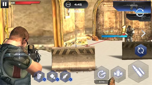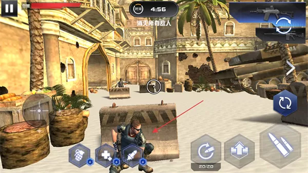 4、发现敌人后,通过屏幕右侧射击按钮等攻击敌人,配合手雷、火箭筒等道具消灭敌人,完成关卡目标。