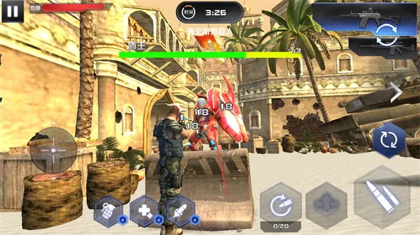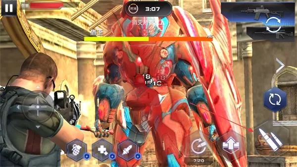 1、进入战斗,遭遇敌人如红色机甲怪物,通过左下方虚拟摇杆走位,利用掩体躲避攻击。
