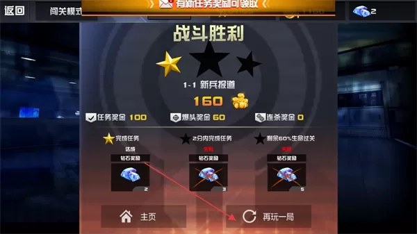 4、战斗胜利后,查看奖励如任务奖金,爆头奖金等,点击再玩一局可重新挑战关卡。