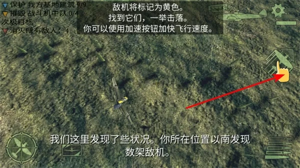4、执行战斗操作,根据提示,找到标记为黄色的敌机,使用加速按钮加快飞行速度击落敌机,完成战斗任务。