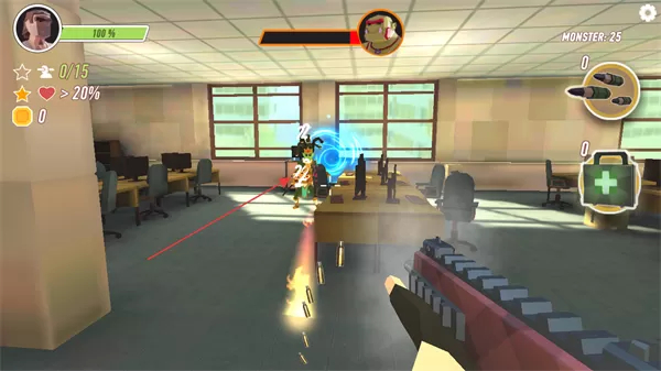 《逃离办公室》是一款动作射击类枪战游戏,其核心设定为白领从遭受僵尸侵袭的办公室逃离。玩家扮演普通白领上班族,所在城市突然遭遇大量僵尸群的袭击,为了生存,不得不拿起武器与怪物对抗。游戏的核心目标是用枪械射击迎面而来的僵尸,最终成功逃离办公室。玩家还能利用射击僵尸获得的金币奖励,购买更多武器装备并对角色进行升级,从而尽可能提升个人战斗实力。