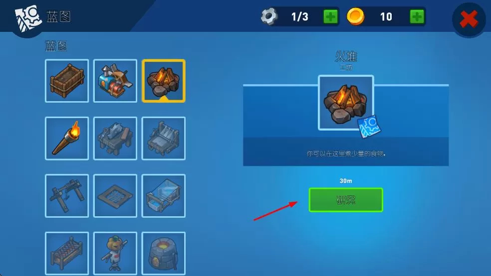 2、在蓝图中研究设施,消耗资源解锁制作配方,提升生存能力。