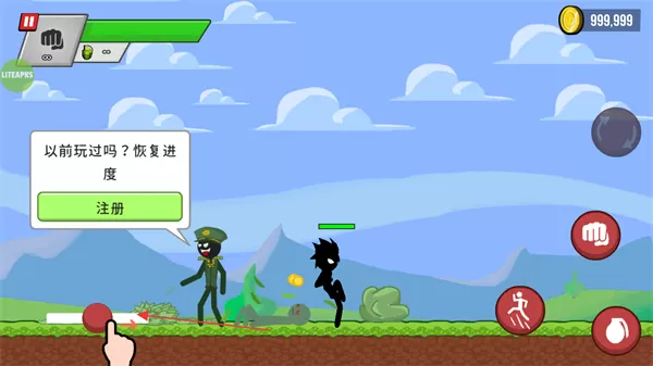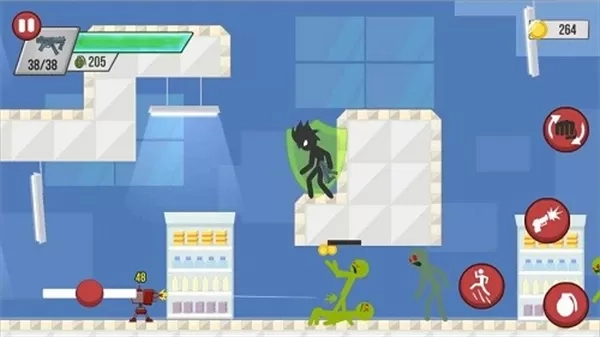 2、遇到僵尸敌人时,点击屏幕右侧拳头按钮,操控火柴人攻击僵尸,获取金币。
