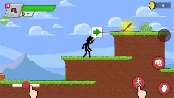 3、前行中遇到地形障碍,点击奔跑按钮助跑,再点跳跃按钮,操控火柴人跳过沟壑。