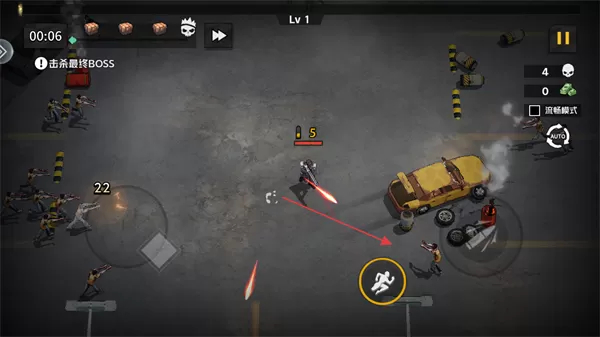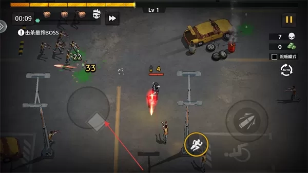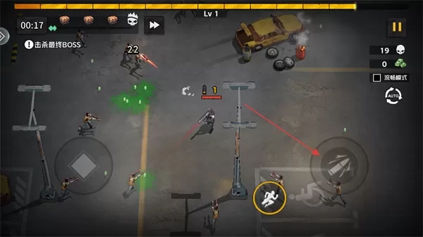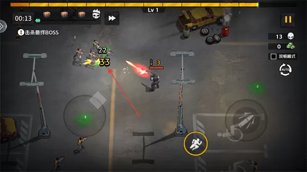 1. 开启游戏,确认当前等级处于Lv1,关卡任务是击杀最终BOSS,利用左下方的虚拟摇杆来控制角色进行移动走位。