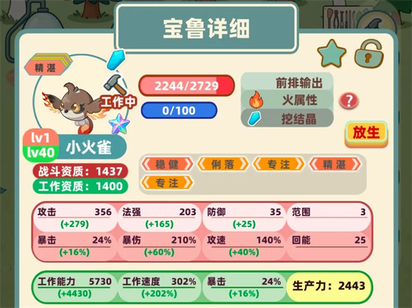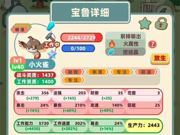 前期打工推荐用1个传说的【高效】或【稳健】+4个金色的【专注】【利落】升到5星(1彩),有了适合打工的奇异宝鲁,直接喂给奇异宝鲁,继承传说词条即可,这样一点都不浪费。奇异宝鲁尽可能全传说词条。