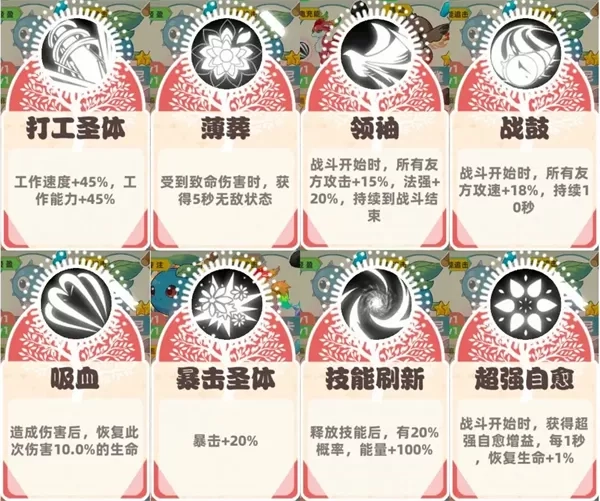 -闪光:会给一个额外的技能,比较有用的是打工的【打工圣体】,【领袖】【薄葬】【战鼓】,【吸血】【暴击圣体】【技能刷新】也能用上,【超强自愈】目前纯摆设。