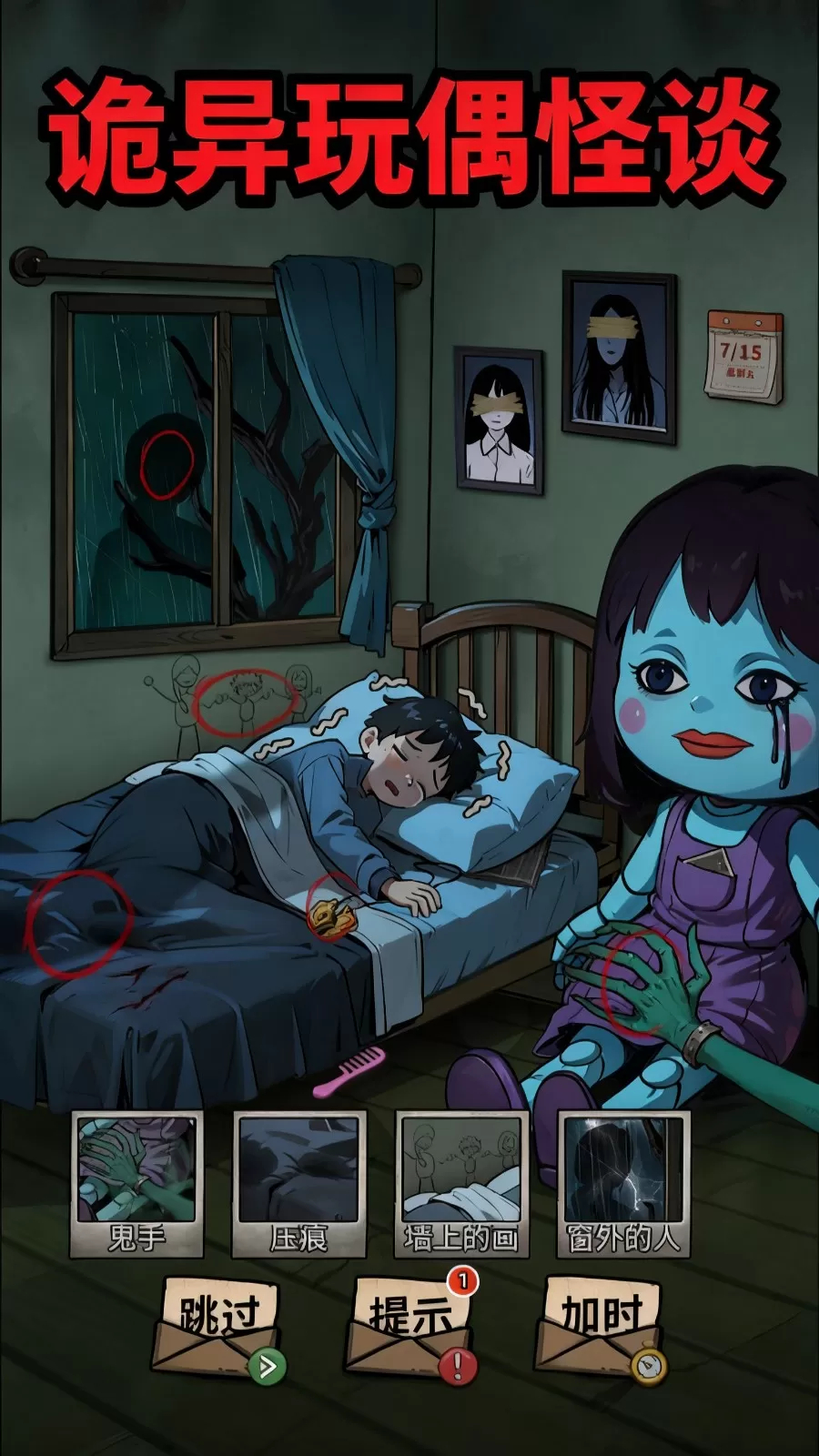 《诡异的怪谈》免费版是一款主打悬疑解谜的游戏。游戏设定在雷雨交加的夜晚,玩家置身于昏暗的房间之中。在这里,需要仔细留意玩偶的异样、窗外黑影的动静等诸多细节,从中找出那些诡异且不同寻常的地方。然后,将这些线索巧妙串联起来,进而揭开雨夜背后隐藏的残酷真相,充分体验这紧张刺激的探谜之旅。
