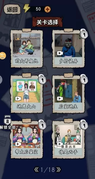 1、开启游戏后,第一步是进行关卡挑选,其中有关卡“前夫哥复仇”“乡村诡异”“逃离大山”等。