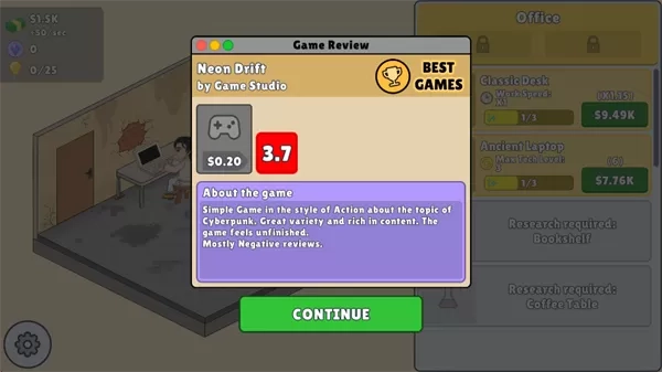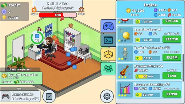 《放置游戏开发模拟器》(Idle Game Dev Simulator)是一款模拟经营类游戏。在游戏中,玩家要白手起家打造自己的游戏帝国。一切从简陋的车库起步,仅有一桌一椅、一人一电脑。玩家全靠自己的努力,为人生增添色彩,开发出属于自己的游戏,以此获取利润。然后用赚来的钱升级办公室,招募优秀员工,逐步发展成为真正的游戏巨头。 在《放置游戏开发模拟器》手机版里,玩家需要挑选合适的游戏类型、热门的主题,还要具备超高的技术水平,才能开发出爆款游戏。与此同时,要合理规划资金,保证收益能够覆盖开发成本,并为后续项目提供支持,全方位体验从无到有、发展为巨头的成长过程。