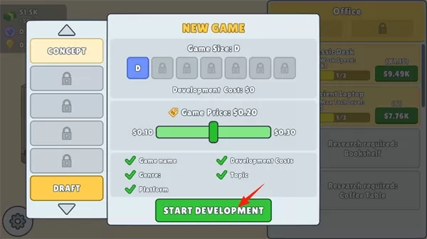 4、接下来设定游戏价格,点击屏幕下方的“START DEVELOPMENT”,着手进行开发。