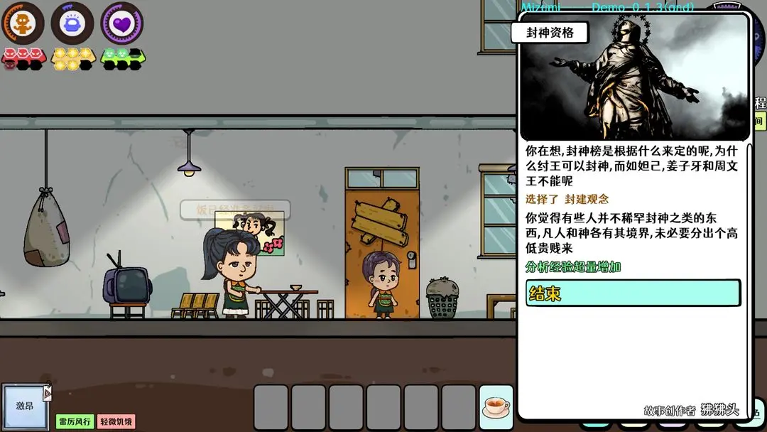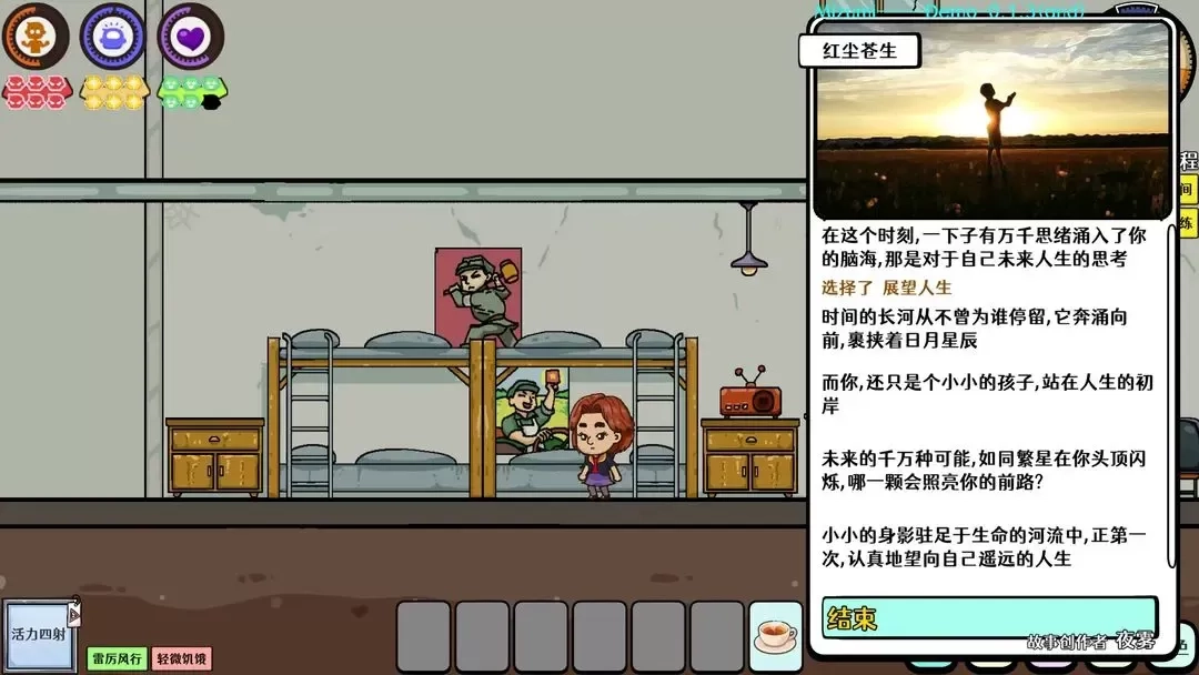 在苍生游戏里,玩家起始身份为3岁孩童,具备体力、脑力、心力这三种基础属性。每日,玩家能获得八次自由行动机会,至于走均衡发展路线,还是专长发展路线,皆由玩家自行决定。游戏包含求学、交友、恋爱、工作、养老等多个阶段,每个阶段都存在诸多选择,部分选择甚至会对角色的一生造成影响,故而玩家需谨慎抉择。总之,游戏的每一次开局,都是全新的起点、全新的故事以及全新的结局。