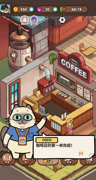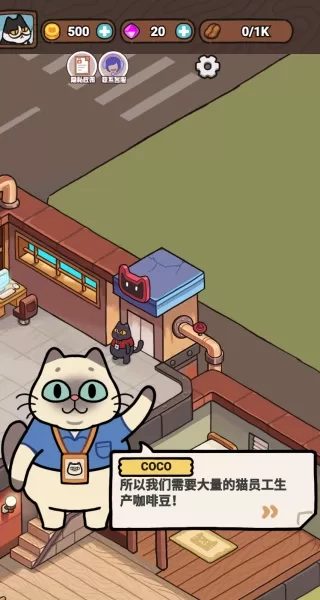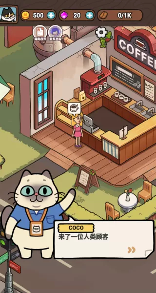1、进入游戏后,你能够依照猫咪的引导来开启自己的猫屎咖啡店。