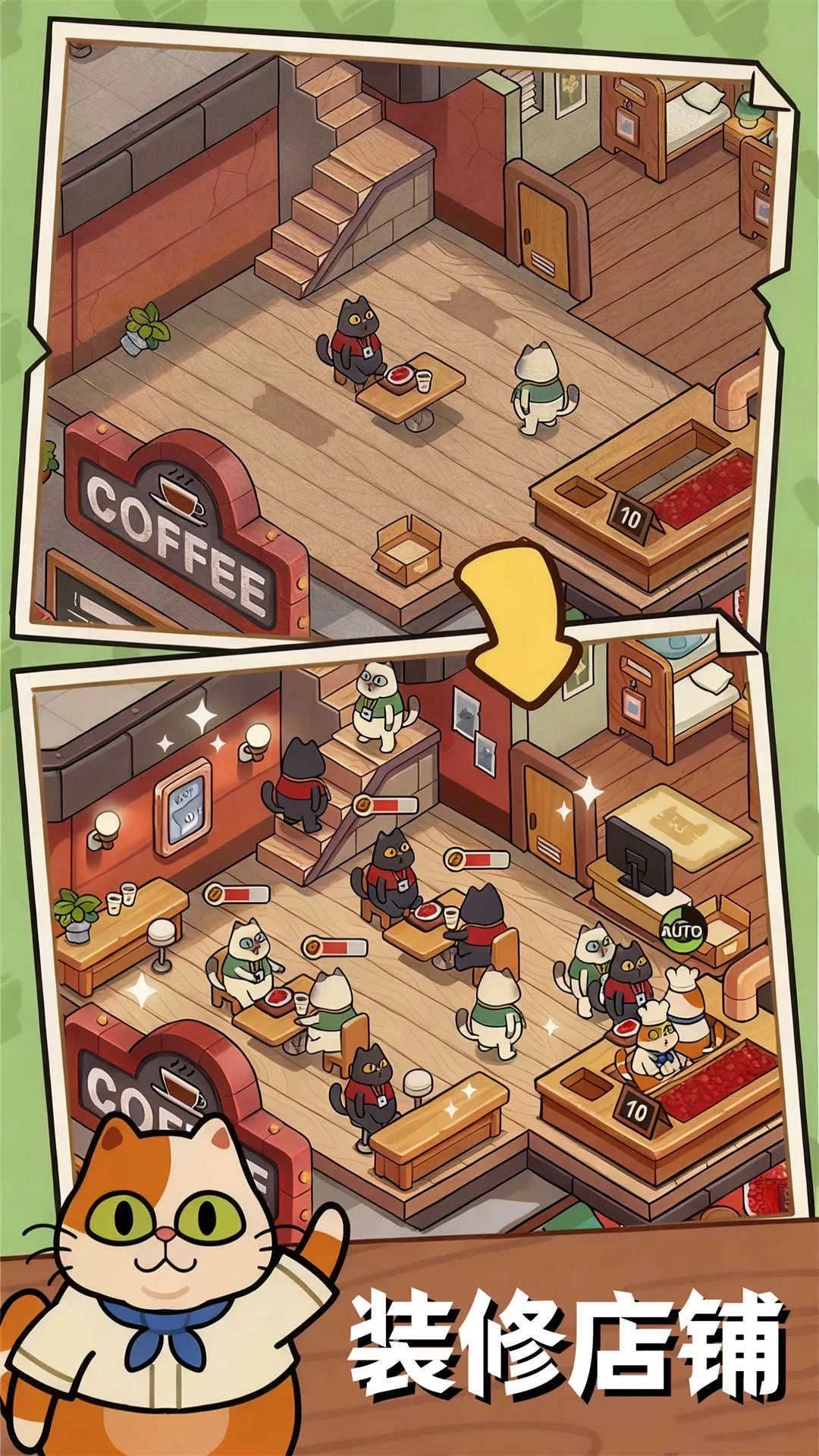 以小猫为主题的经营游戏,我们升级之后,会解锁很多的猫咪,解锁小猫之后,可以通过这些猫咪赚钱,丰富我们的装修,积累财富,把咖啡厅经营的更好