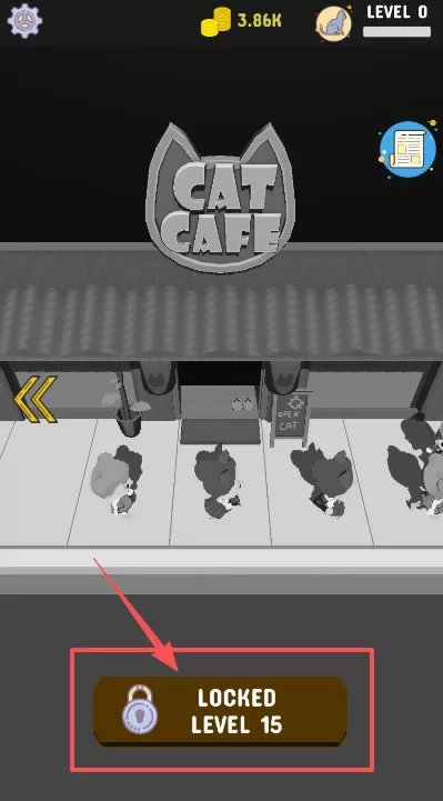4、观猫咖建筑,金币3.86K等级0,看门前猫咪,注意15级解锁内容被锁。