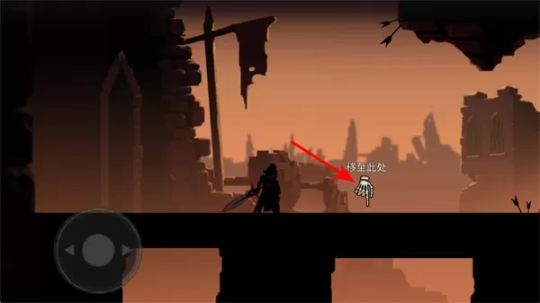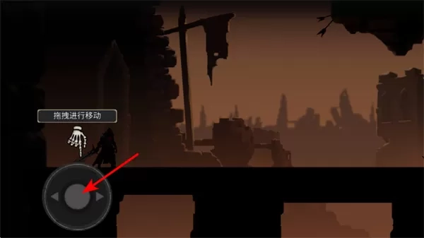 2、操控移动,通过虚拟方向键拖拽进行移动,在废墟场景中操控角色移动,接近区域。