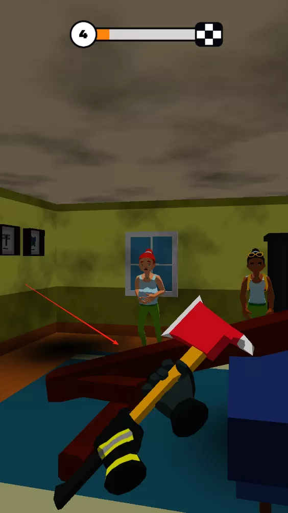 3、先将火灭掉,发现两个女孩被木梁困在里面,再使用斧头将木梁劈开,将女孩解救出来,彻底扑灭大火后完成任务。