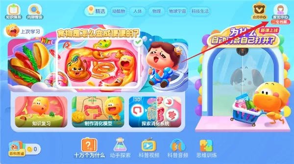 1、打开宝宝巴士科学App,进入用户首页,点击右上角的“家长中心”按钮。