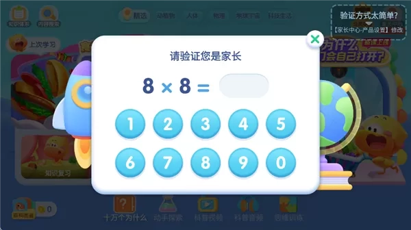 2、在弹出的家长验证页面,根据提示输入正确的数字答案。