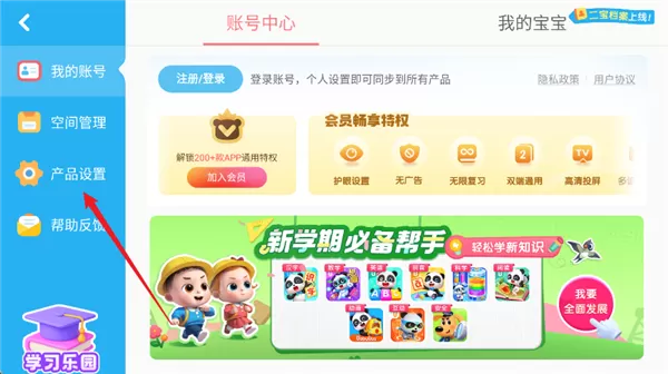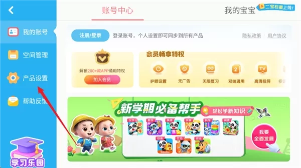 3、进入账号中心页面,点击左侧菜单栏的产品设置”选项。