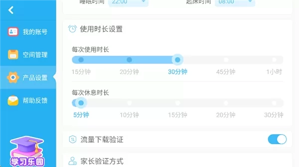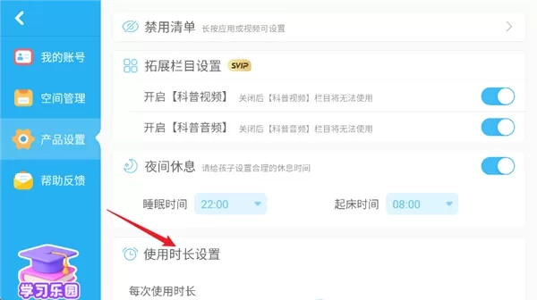 4、查找使用时长设置列表,在此列表中,你能够对每次使用时长以及休息时长进行设置。