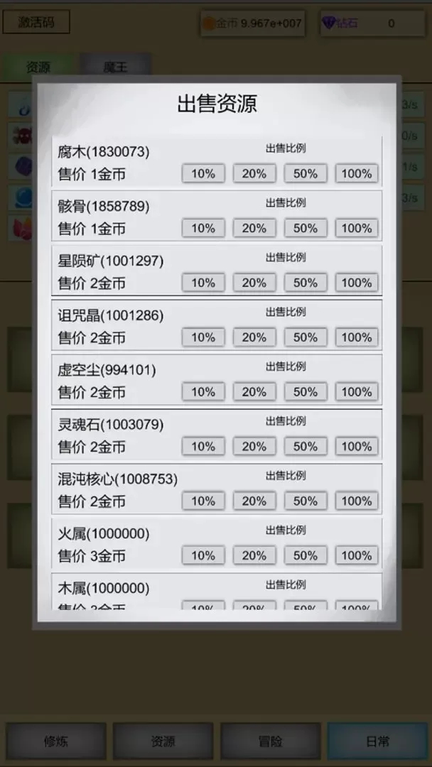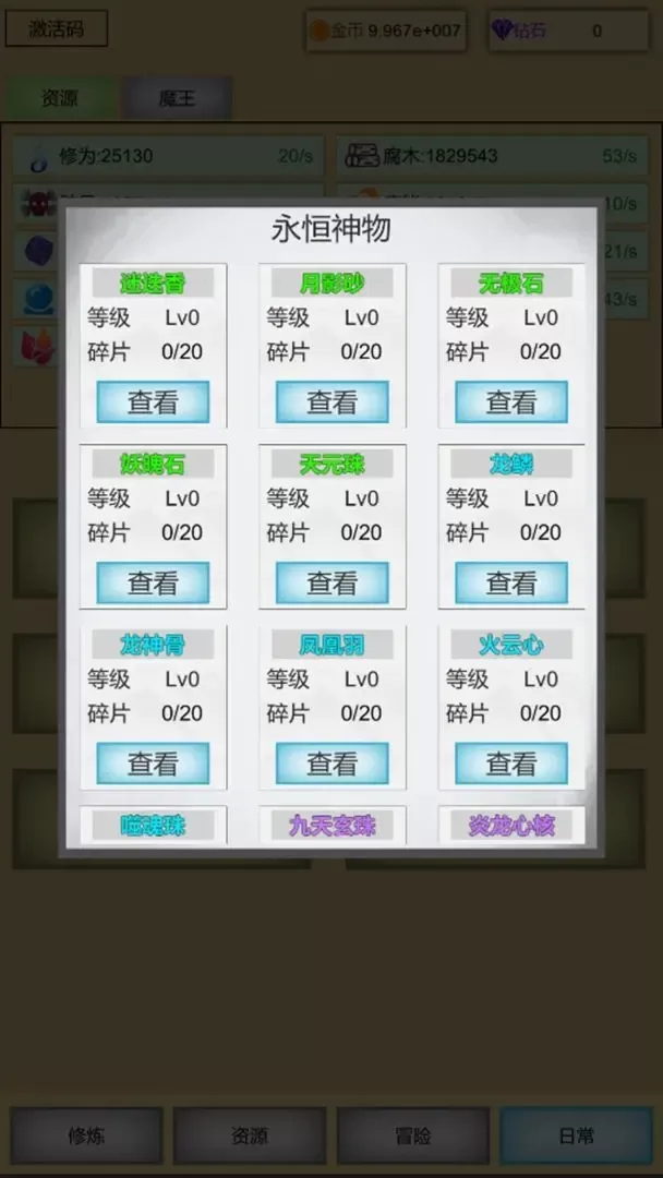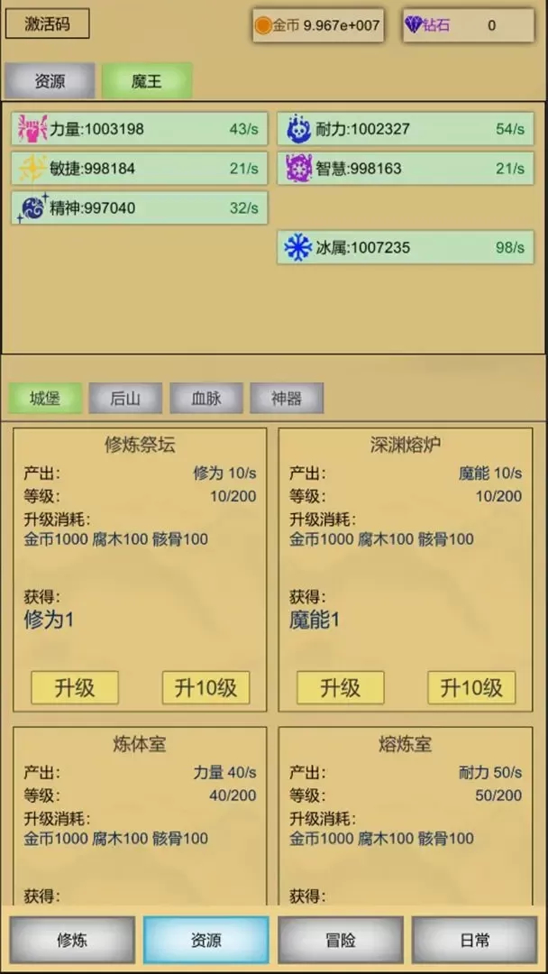 1、玩家持续点击屏幕,积累修炼能量,能量可用于提升魔王各项属性。