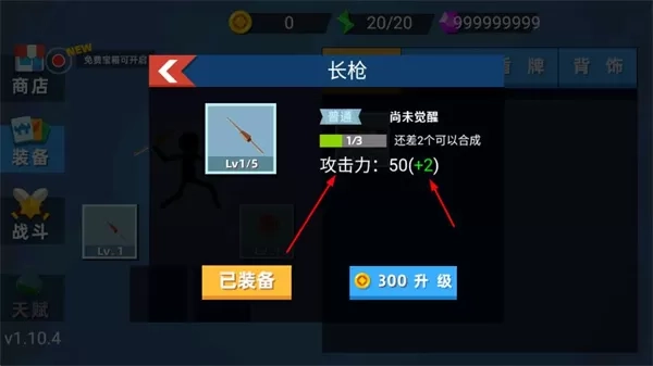 1、在装备界面,可查看和升级武器,提升攻击力等属性,消耗金币进行升级操作,还可合成武器。