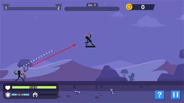3、操控火柴人角色,投掷武器攻击敌人,界面显示生命值、护盾值和关卡进度。