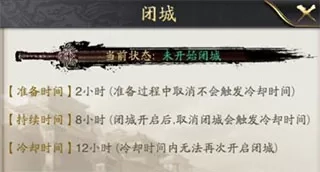 闭城:将城池关闭,避免城池受到其他玩家的攻击。闭城操作存在3种状态,即闭城准备、闭城中和闭城冷却: