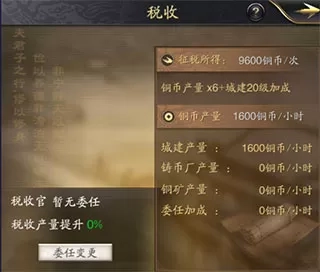 当内政民居成功升级至1级,便能解锁税收系统,该系统是玩家获取铜币的关键途径之一。税收具体分为4种,分别为田赋、山泽税、关市税以及中央税。玩家每天能够免费征收3次田税,而征收其他税收则需耗费20金铢。通过提升城建、铸币厂、铜矿的等级,以及利用委任加成,可增强税收效果。