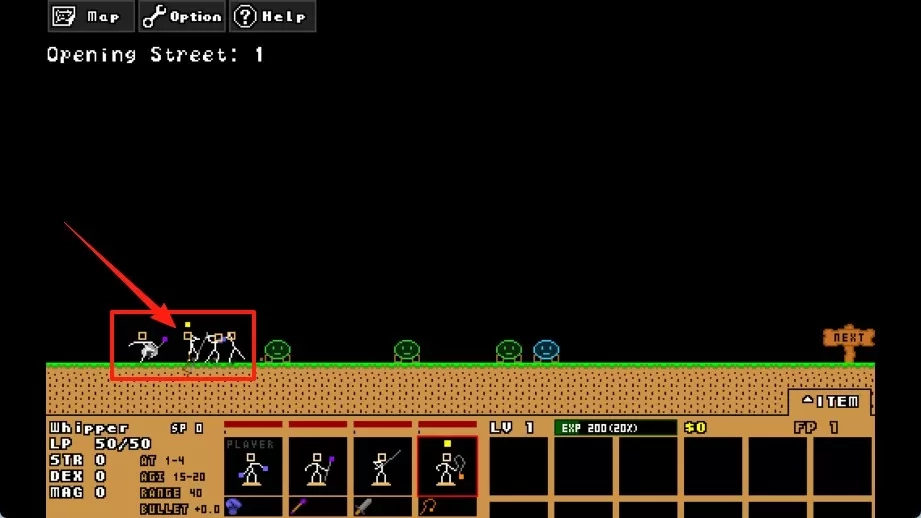 4、瞧,红箭头所指的小人就是你的角色,要留意其血量和攻击范围的数值。