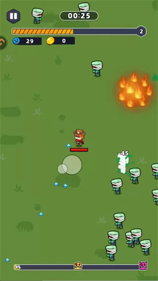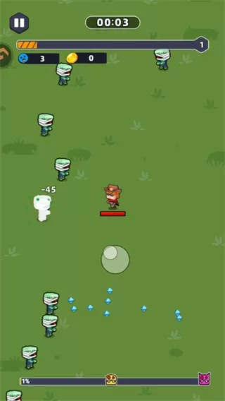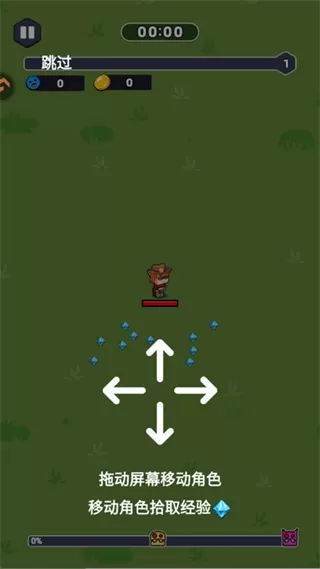 2、用手指滑动控制角色移动,收集经验球,击败出现的敌人。