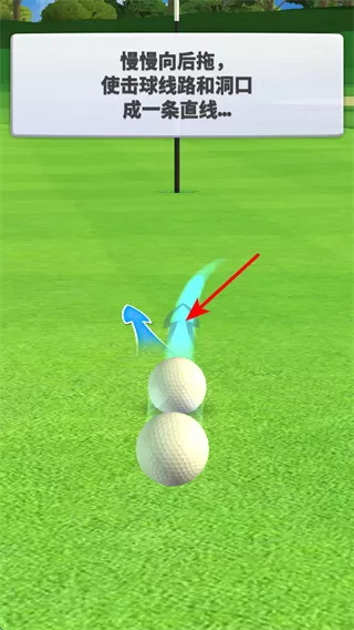 4、对击球线路进行调整,缓缓向后拖拽,让击球线路与洞口处于同一条直线上,以此提高将球打进洞的成功率。