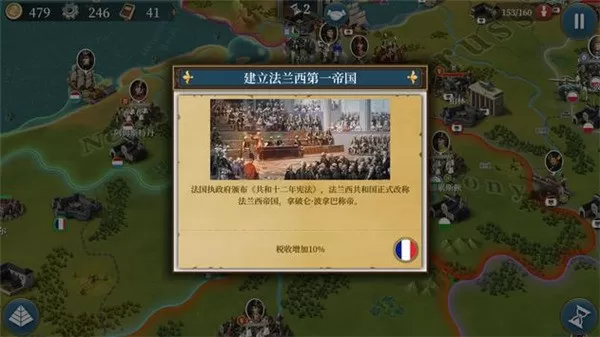 2、征服模式:目前开放 1798、1806、1812(含美洲)三个版本,对应雾月政变、法兰西第一帝国成立、远征俄罗斯等历史背景。核心玩法包括建造军事设施与城市建筑(市场加经济、工业区加工业、民居加人力、大学加文献)、提升国家科技、研究军事战术、触发历史事件(影响战局)、建造奇观(获国家增益)、利用外交系统(资助盟友加速参战、贿赂敌人延缓宣战、主动宣战或援助盟国)。地图中港口与城市绑定,城市失守则港口同步丢失;回合数采用时间化显示(如 1800 春),代入感更强。