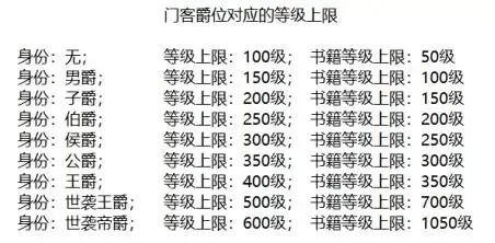 ②各个身份爵位的等级上限和书籍等级上限详细说明如下: