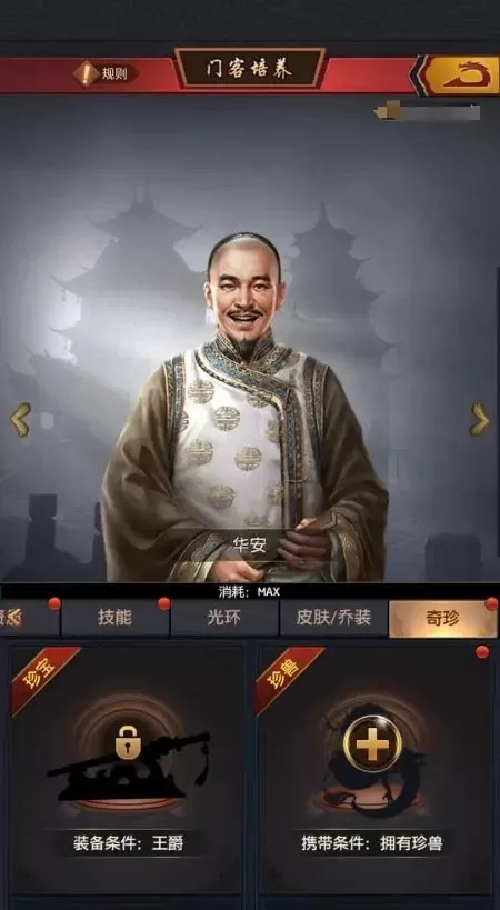 大人在获得珍兽后,可在门客详情珍宝内装备珍兽,门客携带珍兽可获得等级提升,等级提升不受限于门客爵位,最重要的是,提升的等级不需要额外消耗银两资源,因此是提升门客战斗能力的绝佳好物!