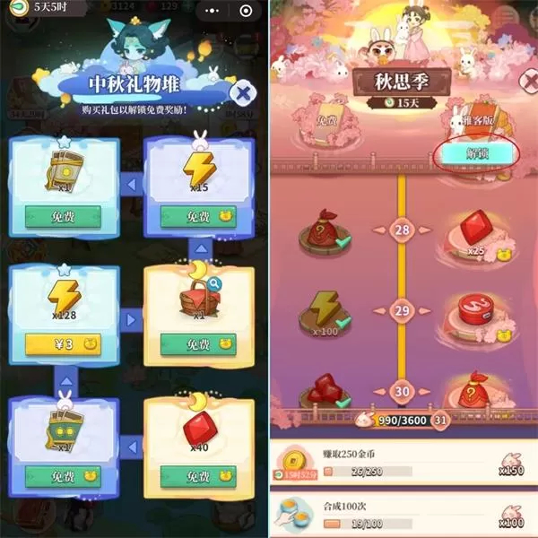 ②季度活动礼包(例如:秋思季),分为不氪和氪金两列。咱们按需来,这也是获得道具的好地方!