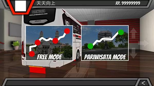 4、选择游戏模式:自由驾驶模式由左侧红点标记,在此模式下可随意行驶,但不能载客;右侧绿点标记的是任务模式,在此模式下需按照地图路线接载乘客,并将其送达指定站点。
