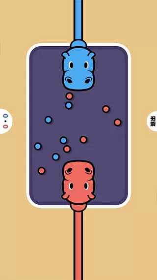 点击屏幕可以操控河马吃掉小球,当玩家吃到自己颜色小球时可以获得2分,吃到对手颜色小球时就会扣除1分,先得到80分的玩家获胜