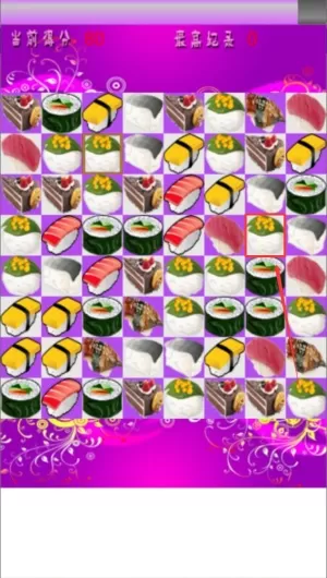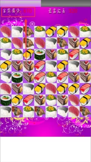 2、通过快速点击相同类型的寿司图案,将三个或以上相同寿司连成一条直线,即可完成消除获得分数。