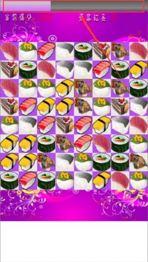3、屏幕上方会显示倒计时进度条,时间耗尽前要尽可能多地消除寿司,否则游戏将自动结束。